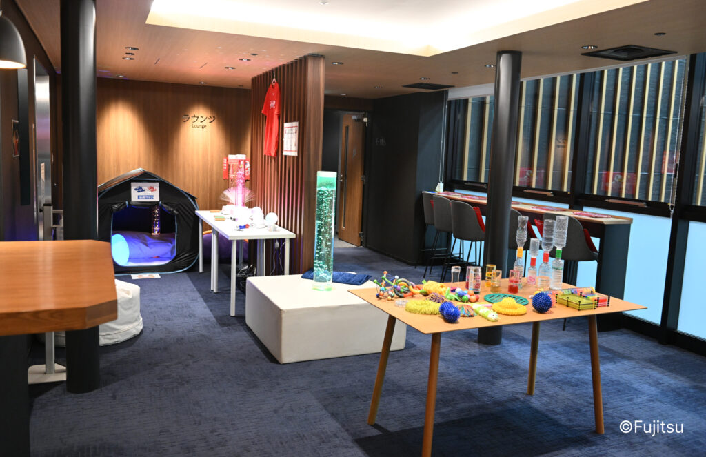 これは、発達障害に伴う感覚過敏などで大きな音や光が苦手なこども向けに、試合時にスタジアムに開設される、遮音された特別室。チームの母体となる富士通株式会社や川崎市などが連携して実施したもので、家族みんなで落ち着いてスポーツ観戦を楽しめると、好評です。