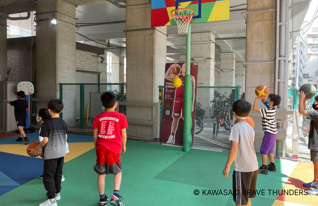 続いて訪れたのは、男子バスケットボールB.LEAGUE「川崎ブレイブサンダース」から、バスケットゴールが寄贈された小学校。校庭ではシュートの練習をがんばるこどもたちの元気な姿。