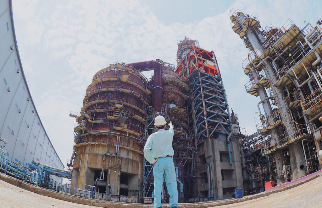 この巨大な設備は、東亜石油株式会社が所有する「フレキシコーカー」。重質油を熱分解してガソリンや軽油を生産する装置で、40年以上前に世界で初めてここ川崎で稼働した、日本唯一の設備です。工場夜景としても大人気!