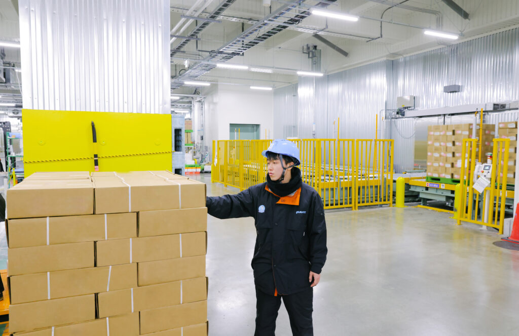 一日に約8万ケースの貨物を取り扱う倉庫。正確で安定した物流を支えるため、チームワークが大切。一方で零下25度にもなるため、けがやミスのないように、体を温めながら作業しているそうです。