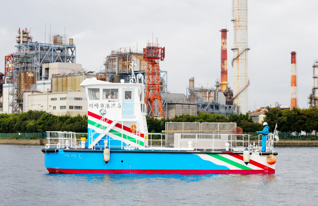 川崎港では、港内の環境美化と海洋汚染防止のため、専用の清掃船が日々活躍しています。