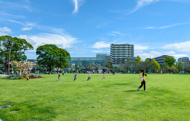 みどりの遊具広場のすぐ隣には、広々とした芝生広場が。レジャーシートを広げてお弁当を食べている家族、日光浴を楽しむ外国籍の皆さん、ラジオ体操をするシニアの皆さん。世代も国籍も様々な人たちが、同じ空間でゆったりと豊かな時間を過ごしています。