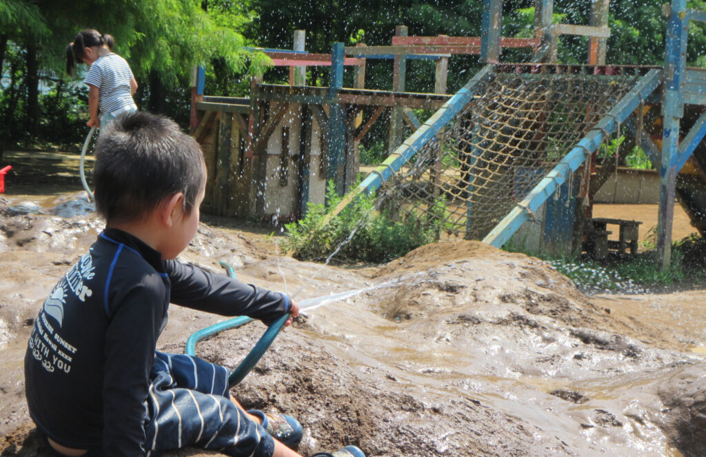 屋外の広いスペースでこどもたちが木登りや泥遊び、水遊びなどを、思い思いに、のびのびと楽しんでいます。